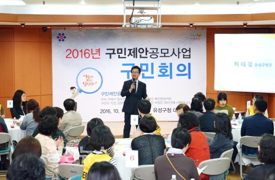 대전 유성구(구청장 허태정)는 2017년도 예산에 반영할 총 3억 3천만 원 규모의 구민 제안사업을 지난 11일 구청 대회의실에서 열린 구민회의를 통해 최종 4건을 선정했다고 밝혔다.
