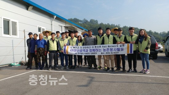 한국철도시설공단 강원본부(본부장 노병국)는 공단 청년중역 등 만40세 이하 젊은 직원들로 구성된 봉사단원들이 10월 12일(수) 원주시 소초면 수암4리 마을을 찾아 과수원 농가의 부족한 일손을 도우며 구슬땀을 흘렸다고 전했다고 밝혔다.
