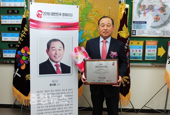 충남 황선봉 예산군수가 14일 미래창조과학부와 산업통상자원부가 후원하는 ‘2016 대한민국 경제리더 대상’ 상생경영 부문 대상자로 선정됐다고 밝혔다.