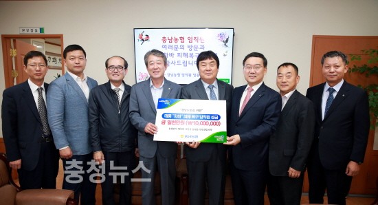 충남농협 유찬형 본부장을 비롯하여 이주선 충남농협조합운영협의회장, 류병관 농협노조세종·충남지역위원장은 10월 14일 농협중앙회 부산지역본부와 경남지역본부를 방문하여 피해 복구 지원을 위해 임직원들이 모금한 성금으로 각각 1,000만원씩 전달했다.