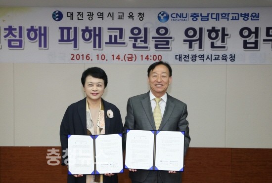 대전시교육청(교육감 설동호)은 10월 14일 대전교육청 중회의실에서 충남대학교병원과 교권침해 피해교원을 위한 업무 협약을 체결했다고 밝혔다.