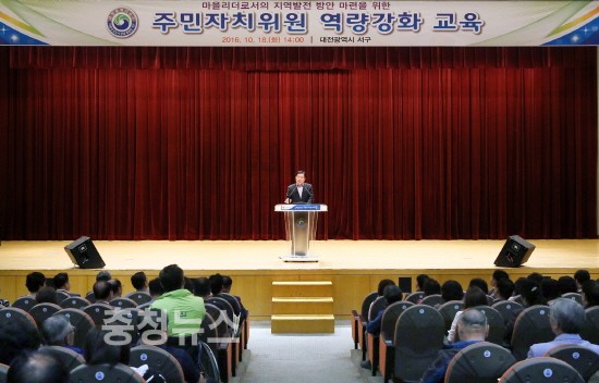 대전 서구(구청장 장종태)는 18일 구청 대강당에서 각 동 주민자치위원 300여 명이 참석한 가운데 “유쾌한 인문학으로 배우는 창의와 혁신의 리더십”이라는 주제로 ‘2016년 주민자치위원 역량 강화 교육’을 했다고 밝혔다.