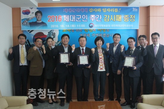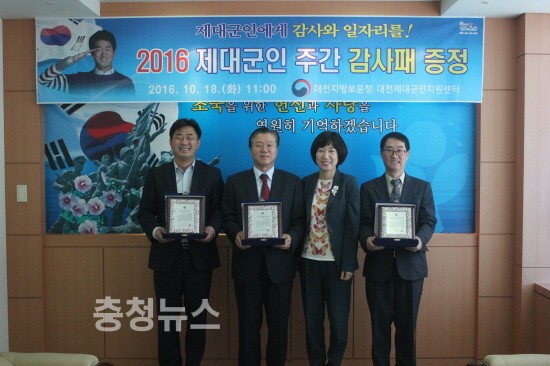대전지방보훈청(청장 강윤진)은 2016「제대군인주간」을 맞아 18일 제대군인 전직지원 사업 및 사회정착에 기여한 유공기관에 감사패를 수여하고 감사의 뜻을 전했다고 밝혔다.