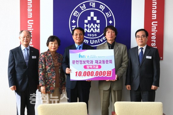 ▲ 한남대 문헌정보학과 이경한 재교동문회장(오른쪽 두 번째)이 이덕훈 총장(왼쪽 세 번째)에게 학과 장학기금 1,000만원을 기탁하고 있다.