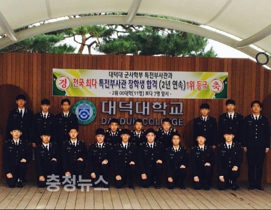 대덕대학교(총장 김상인) 군사학부 특전부사관학과가 지난 21일 발표된 2016년도 특전사 군장학생 선발에서 지난 2년 연속 전국 최다 합격으로 2015년도 합격자는 18명, 2016학년도 합격자는 18명으로 대학 명성을 떨쳤다고 밝혔다.