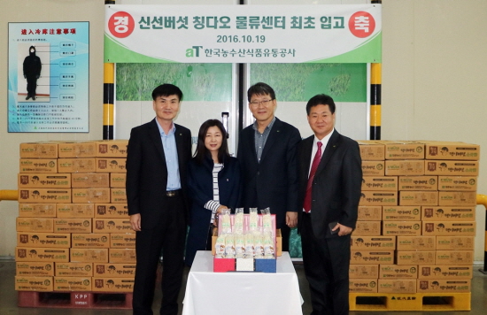 농림축산식품부(장관 김재수)와 한국농수산식품유통공사(aT, 사장 여인홍)는 지난 10월 19일(수) 칭다오로 수입된 신선버섯의 「한국농수산식품 물류센터」(이하 「aT물류센터」) 첫 입고를 기념하는 행사를 개최하였다고 밝혔다.