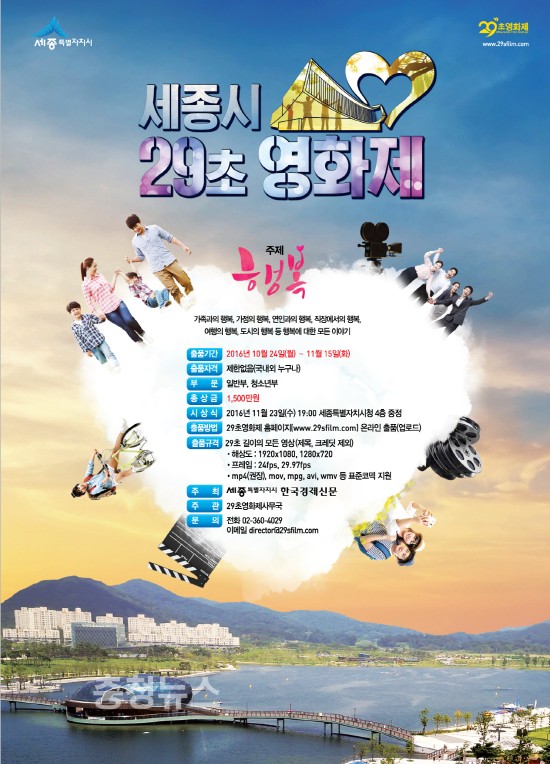 세종특별자치시(시장 이춘희)는 24일부터 ‘일상의 행복’라는 주제로 세종시 29초 영화제 작품을 공모한다.
