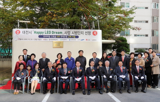 대전시가 24일 공동주택 LED 조명 확산을 위해 시범사업 대상 아파트로 선정된 가람아파트, 둥지아파트, 누리아파트와 ‘Happy LED Dream 금융모델 사업 공동협력’협약과 현판식을 진행했다고 밝혔다.
