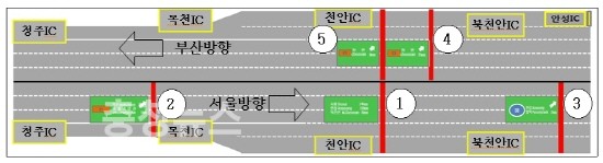 한국도로공사 대전충청본부는 오는 26일(수) 경부선 목천 IC (328.48k,서울방향), 천안IC(341.46,양방향, 342.46,부산방향) 안성IC(357.94, 서울방향) 지점 본선을 한국도로공사 천안지사에서 시행하는 시설물 연간 유지보수공사의 문형식 표지판 해체 작업을 위해 10월26일~27일 새벽 1시, 문형식 표지판 설치 및 해체작업을 위해 10월 28일,11월 1일,11월 2일 자정과 새벽3시 각 10분간 전면 차단 한다고 밝혔다.