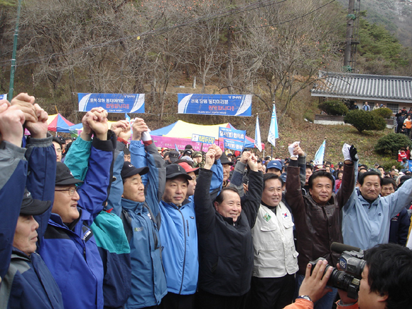 충청의 명산 계룡산에서 2일 열린 한나라당 중부권 당원단합대회에서 시도당 지도부들이 '2007년 대선 필승'을 기원하며 갑사에서 동학사까지