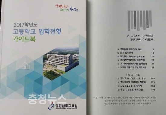 충남도교육청(교육감 김지철)은 2017학년도 고등학교 입학전형 방법을 안내하는 ‘2017학년도 고등학교 입학전형 가이드북’을 제작해 도내 중ㆍ고등학교 및 교육지원청에 배부했다고 25일 밝혔다.