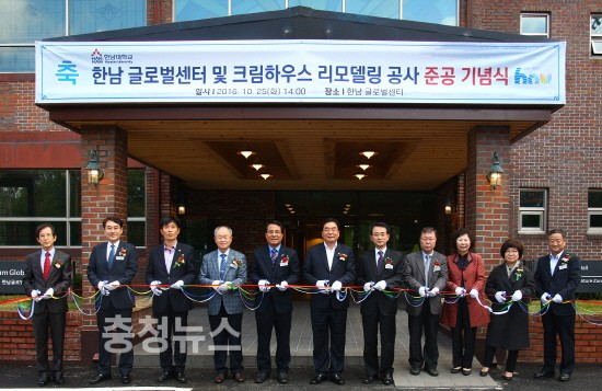 한남대(총장 이덕훈)는 25일 박수범 대전대덕구청장과 박종래 대덕구의회의장 등 외빈과 교수, 직원, 학생 등 150여 명이 참석한 가운데 '한남글로벌센터 및 크림하우스 리모델링 준공 기념식'을 가졌다고 밝혔다.