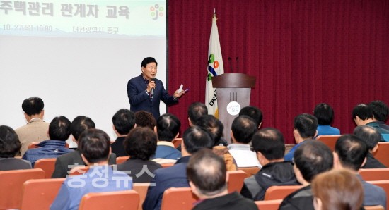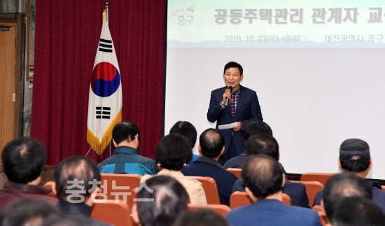 대전 중구(구청장 박용갑)는 27일 구청 대회의실에서 살기좋은 아파트 문화조성을 위해 71개 단지 관리사무소장 및 공동주택 입주자대표 등 150여 명이 참석한 가운데 ‘공동주택관리 관계자 교육’을 실시했다고 밝혔다.