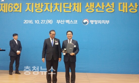 충남 당진시가 지난 27일 부산 백스코에서 개최된 제6회 지방자치단체 생산성 대상 시상식에서 우수기관으로 선정돼 행정자치부장관상을 수상했다고 밝혔다.