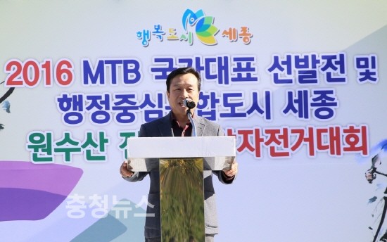 ▲ 이충재 행복청장(연단 위)이 30일(일), 행복도시 ‘원수산 MTB공원’에서 개최된 '2016 전국 산악자전거(MTB)대회‘에 참석하여 축사를 하고 있다.