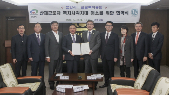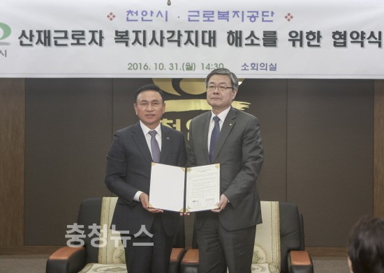 충남 천안시는 31일 오후 2시 30분 시청 소회의실에서 근로복지공단(이사장 이재갑)과 산재근로자 복지사각지대 해소를 위한 업무협약을 체결했다고 밝혔다.