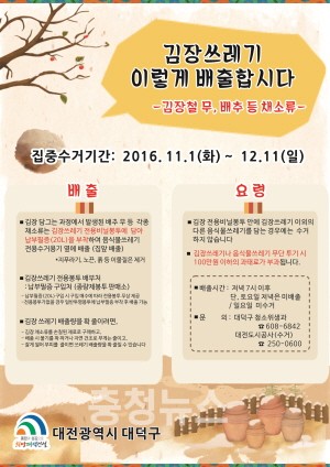대전 대덕구(구청장 박수범)는 김장철이 다가옴에 따라 일시적으로 다량 발생하는 김장쓰레기를 효과적으로 처리하기 위해 김장쓰레기 특별 수거 대책을 추진한다고 31일 밝혔다.