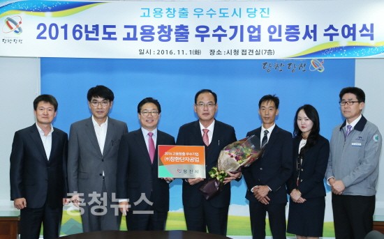충남 당진시 부곡공단에 위치한 ㈜창환단자공업(대표 김환창, 권오천)이 2016년 일자리 창출분야 우수 기업으로 선정돼 1일 당진시로부터 고용창출 우수기업 인증서와 현판을 전달 받았다고 밝혔다.