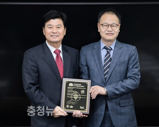 ▲ 영국표준협회(BSI)로부터 국제인증(ISO22301)을 획득 수여식 모습 (왼)이춘희 세종시장 / 오른쪽 : 이종호BSI코리아 대표이사)