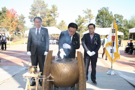 ▲ 최홍묵 시장은 1일 엄사면 충령탑에서 제36회 자유수호 희생자 합동위령제에 참석 분향하고 있다.