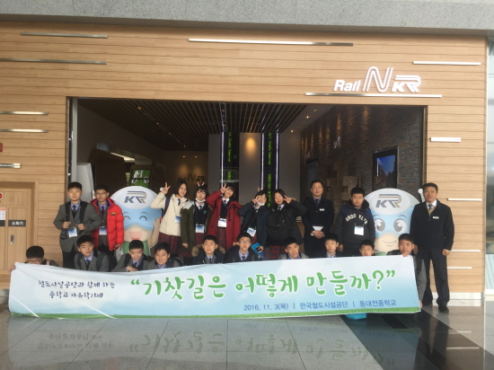 한국철도시설공단(이사장 강영일)이 학생들에게 폭넓은 학습경험을 제공하기 위하여 11월 3일(목) 동대전중학교 학생들을 대상으로 ‘자유학기제 진로체험행사’를 시행했다고 밝혔다.