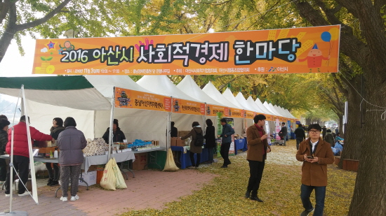 충남 아산시(시장 복기왕)는 지난 3일 아산 자활기업, 수피아사회적협동조합, 아산제터먹이사회적협동조합 등 14개 법인이 참여한 가운데 낙엽이 아름다운 곡교천 은행나무길 일원에서 『2016 아산시 사회적경제 한마당 행사』를 성황리에 마쳤다고 밝혔다.