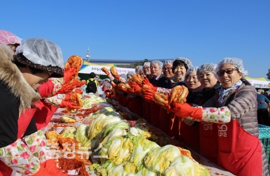 농협임직원 성금으로 운영되는 우리농업지키기운동본부(충남본부장 류병관)의 1500kg, 충남농협에서 9500kg 등을 지원받아 총 1100kg(10kg포장 1100포장박스)에 달하는 김장담그기 축제를 펼쳤다.