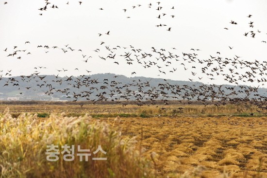 우선 큰기러기, 쇠기러기 등 10만여 마리가 군무를 이루는 풍경은 한 폭의 그림과 같은 장면이다.