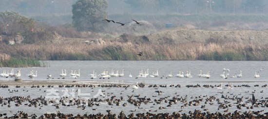 또한 청둥오리와 흰빰검둥오리 등 오리류 5만여 마리가 하천과 갈대숲 일대에서 먹이를 찾느라 분주한 모습을 보이고 있다.