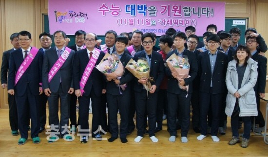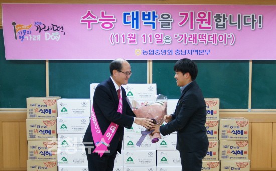 농협중앙회 충남지역본부(본부장 유찬형)는 가래떡데이(11월11일)를 하루 앞둔 10일 논산 대건고등학교(교장 강승구)에서 수험생 을 응원하기 위한 수능대박 기원! 가래레떡데이 행사를 가졌다.