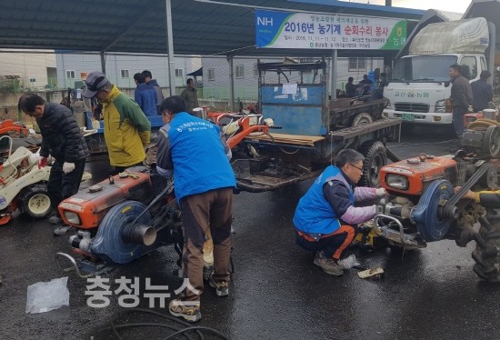 이번 농기계 수리봉사는 토요일 휴일까지 반납하고 충남농협기술자협의회 회원과 농기계생산업체 기술자 등 40여명이 이앙기, 경운기, 관리기, 예취기, 동력분무기 등 소형농기계 170여대를 무상 점검·수리하여 농가의 영농비 부담을 크게 덜어 주었다.