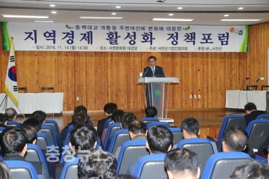 지역경제 활성화 정책포럼은 서천군이 후원하고 기업인협의회가 주관한 행사로 동백대교 개통, 장항국가산업단지 준공 가시화 등 지역내 변화와 새만금사업, 수산물유통가공특화단지 조성, 신역세권 택지개발 등 인근 지자체의 여건변화가 지역경제에 어떠한 영향을 줄 것인지 분석하고, 이러한 변화에 맞춰 지역경제에 긍정적인 효과를 줄 수 있는 정책에 대해 논의됐다.