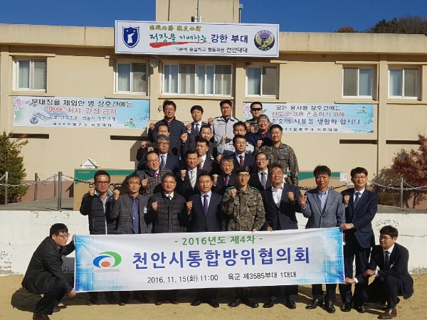 충남 천안시는 15일 천안시통합방위협의회 위원과 읍‧면‧동 방위협의회장 등 40여 명이 참석한 가운데 육군 제3585부대 1대대(대대장 이재진)에서 2016년 제4차 천안시통합방위협의회의를 개최했다고 밝혔다.