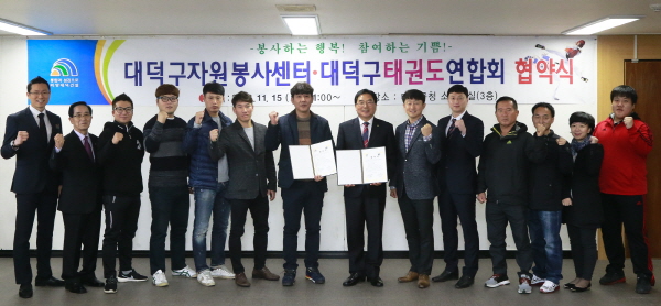 대덕구자원봉사센터(이사장 박수범)는 15일 대덕구태권도연합회(회장 최종훈)와 구청 소회의실에서 나눔문화 확산 및 자원봉사활동 참여 상호협력을 위한 자원봉사 공동협력 협약식을 개최했다고 밝혔다.