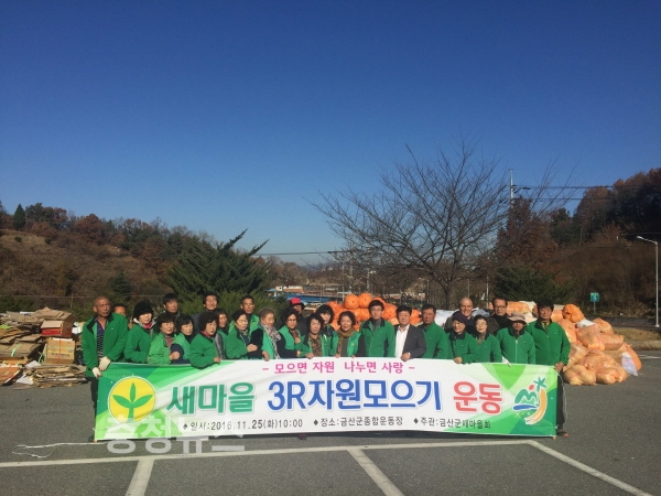 충남 금산군새마을회(회장 양현철)는 지난 15일 금산군 종합운동장에서 새마을지도자·새마을부녀회장 등 회원 100여명이 참여한 가운데 3R자원다시모으기 하반기 경진대회를 개최했다.