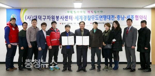 대덕구자원봉사센터(이사장 박수범)는 16일 구청 소회의실에서 나눔문화 확산 및 자원봉사활동 참여 상호협력을 위해 세계경찰무도연맹 대전․충남․세종 경찰무도협회(회장 장현이)와 자원봉사 공동협력 협약식을 맺는 뜻 깊은 자리를 마련했다.