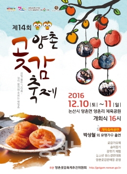 충남 논산시는 2016 양촌곶감축제가 오는 12월 10일부터 11일 이틀간 양촌리 체육공원에서 ‘감빛 물든 그리움 정이 물처럼 흐른 햇빛촌’을 주제로 다채롭고 풍성하게 열린다고 밝혔다.