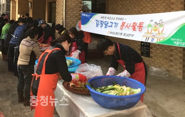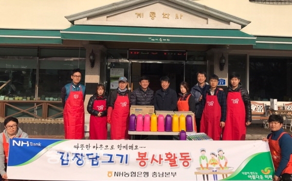 NH농협은행 충남영업본부(본부장 이강신)는 11월 17일(목) 논산시 연산면에 위치한 사회복지법인 계룡학사(원장 유창학)를 방문하여 김장담그기 봉사활동을 실시하였다.