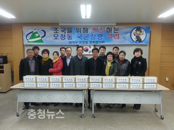 대덕구 오정동 방위협의회(위원장 전근기)에서는 지난 16일 동절기를 맞이해 자생단체 회원 자녀와 관내 지역주민 자녀 등 국방의 의무를 성실히 수행하고 있는 군장병 20여명에게 마스크, 귀마개, 장갑 등 위문품과 위문편지를 전달했다.