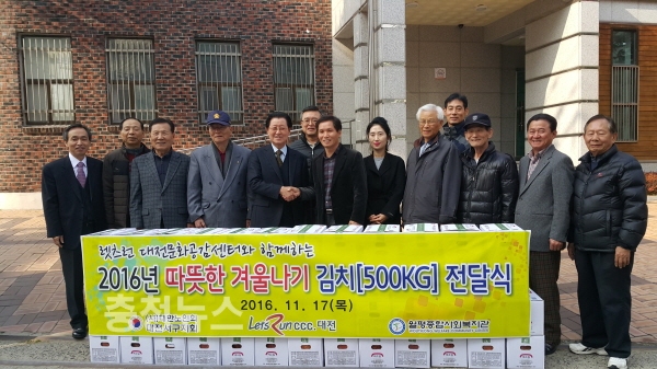 렛츠런 대전문화공감센터(남부권역본부장 겸 센터장 김홍기)에서는 지역주민의 따뜻한 겨울나기를 지원하기 위해 17일 (사)대한노인회 대전광역시서구지회(지회장 박세용)와 월평종합사회복지관(관장 최주환)에 김치 500KG을 지원하였다.
