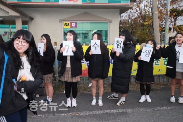 김 교육감은 선배들을 응원하기 위해 새벽부터 나온 재학생들과 학부모, 교직원 등과 함께 대천여고 수험장으로 입실하는 수험생들에게 격려구호를 외쳐주고, 따뜻한 차를 타서 건네주는 등 활동을 펼쳤다.