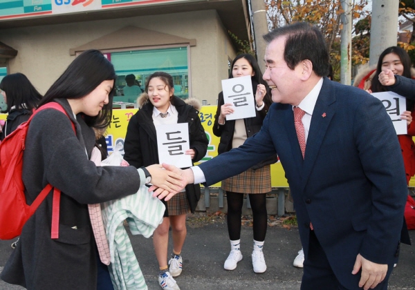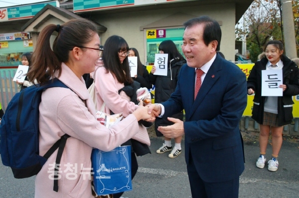 김지철 충남교육감이 17일 대천여고 정문 앞에서 2017학년도 대학수학능력시험 수험생 응원에 나섰다.