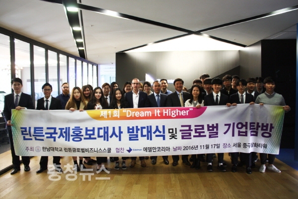 11월 17일(목) 한남대학교 린튼글로벌비즈니스스쿨(학장 박광일) 국제홍보학생대사들이 에델만코리아(서울 삼화타위)에서 전문성 및 국제화 선도를 위한‘Dream it Higher 린튼 국제홍보대사 발대식’을 개최했다.