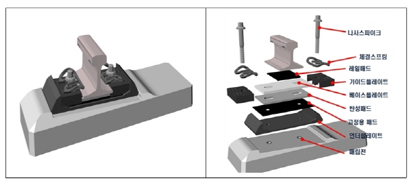 레일체결장치는 레일과 침목을 고정하여 열차하중으로부터 레일간격을 일정하게 유지하는 역할을 하는 구성품의 조합체이다.