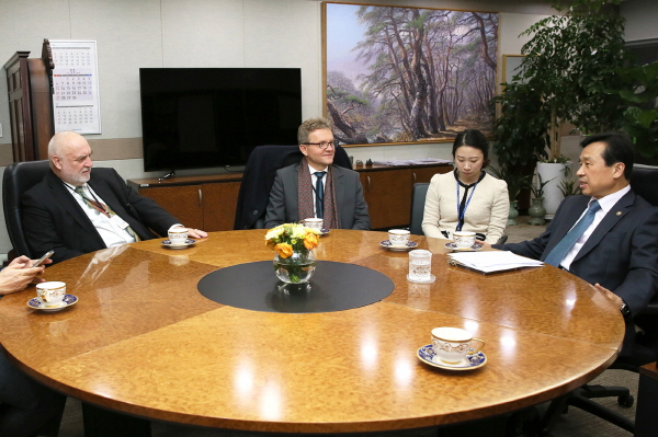 이충재(맨 우측) 행정중심복합도시건설청장이 17일(목) 정부세종청사에서 알프레드 프리츠(맨 좌측) 프로이드대 총장 및 파벨 마나섹(좌측 두번째) 브르노 예술대 총장과 함께 행복도시 내 대학설립 방안을 논의하고 있다. 행복청 제공