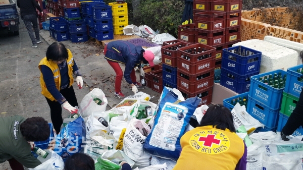 남면 적십자봉사회원들이 이웃돕기 기금을 마련하기 위해 공병을 모으고 있다