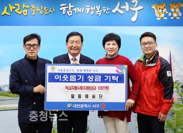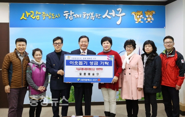 대전 서구(구청장 장종태)는 지난 21일 구청 다목적실에서 일품예술단(회장 손정철)로부터 이웃돕기 성금 1백만 원을 전달받았다고 밝혔다.