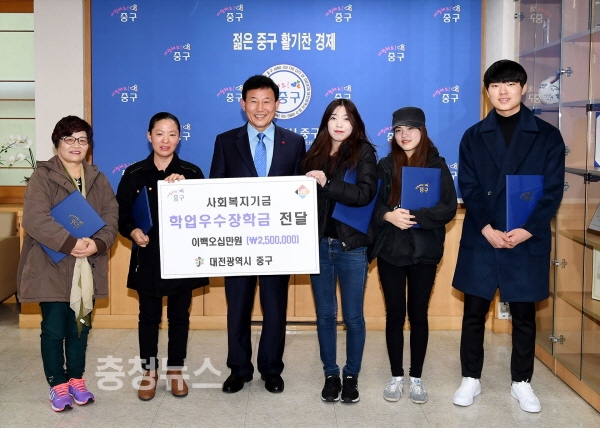 대전 중구(구청장 박용갑)는 21일 구민사랑방에서 저소득층 주민의 복지증진을 위해 운영하고 있는 사회복지기금을 활용해 학업성적이 우수한 모범 고등학생 5명에게 장학금 250만원을 전달했다.