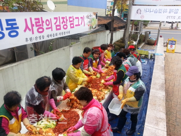 대전 중구 산성동 자원봉사협의회(회장 백태화)는 22일 동주민센터에서 자원봉사 및 새마을회 회원 등 30여 명이 참여한 가운데 사랑의 김장나눔 행사를 개최했다.