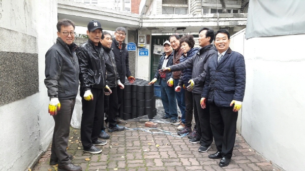대전 중구의회 이정수 의장이 국제로타리3680지구 대전둔산로타리클럽 이석만 회장 등 회원들과 대전 중구 목동에서 연탄봉사로 구슬땀을 흘렸다.